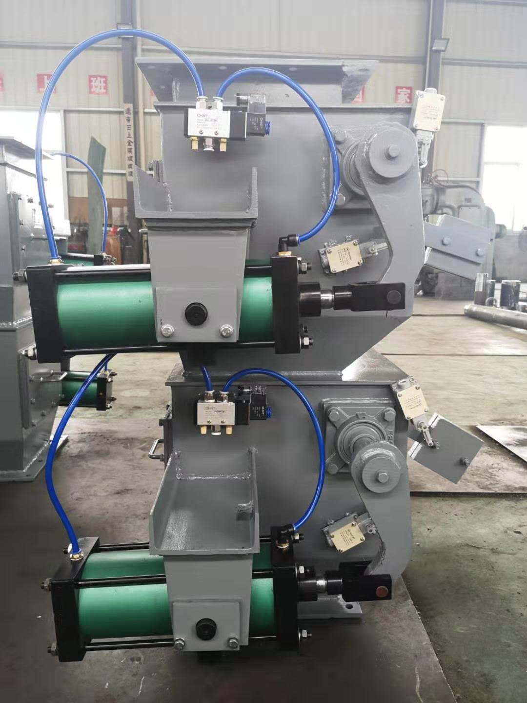 新型復(fù)式智能電動雙層卸灰閥上、下閥采用獨立驅(qū)動裝置,分別控制上、下卸灰閥打開或關(guān)閉。密封部位采用軟性密封件,且密封件通徑大于卸灰閥閥口通徑,卸料過程對密封件無沖刷,保證了密封件使用壽命。本卸灰閥工作時,系統(tǒng)程序與皮帶聯(lián)動,初始狀態(tài)為上閥常開,下閥關(guān)閉,將大煙道中的物料通過料倉儲存在卸灰閥中部儲料倉中。按PLC程序依次定時、定量排料,關(guān)閉上卸灰閥后打開下卸灰閥,將中部儲料倉的物料卸出,卸料完成關(guān)閉下閥后再打開上閥,進入下個循環(huán)程序。如遇大量落料,物料在卸灰閥中部儲料倉堆積高度到達阻旋料位計時,PLC接收到信號后將進入排料程序,排料后系統(tǒng)自動恢復(fù)至定時排料程序。由于在此過程中,始終有一個閥處于關(guān)閉狀態(tài),因此保證了系統(tǒng)的氣密性,負壓波動小,生產(chǎn)穩(wěn)定,煙道下料倉只是落料通道物料落入卸灰閥中部料倉內(nèi),卸灰閥完成排料工作,徹底解決了堵倉現(xiàn)象。從而保證了卸灰系統(tǒng)在不漏風的狀態(tài)下正常運行。